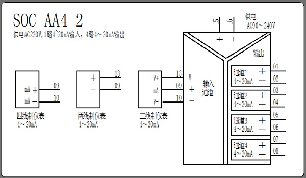 根據(jù)現(xiàn)場(chǎng)儀表的不同,隔離器的接線方法也不同,SOC-AA4-2-N可以接四線制、三線制、兩線制電流信號(hào).