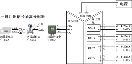 電流信號分配器SOC-AA4-2-N是中泰華旭新推出的一款信號隔離分配器,帶有配電功能,基于工控級的一款標(biāo)準(zhǔn)一進(jìn)四出隔離分配器,采用磁隔離技術(shù)保證隔離器的隔離功能:輸入、輸出、通道、電源間全隔離,能夠屏蔽現(xiàn)場各種干擾信號;同時(shí)保證輸出信號不衰減,提供高精度信號。輸入端可接四線制、三線制、兩線制電流信號。新款的1分4電流信號分配器,根據(jù)現(xiàn)場的不同儀表可以選擇輸入回路是否需要帶配電。工程師在選型時(shí),有時(shí)難以確定現(xiàn)場儀表是兩線制還是三線制,還是四線制,選擇SOC-AA4-2-N解決了這樣的問題,三種情況都可以使用!