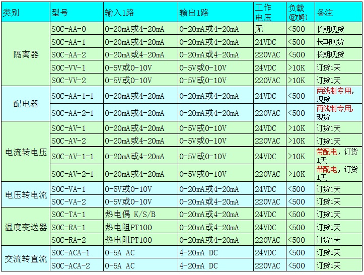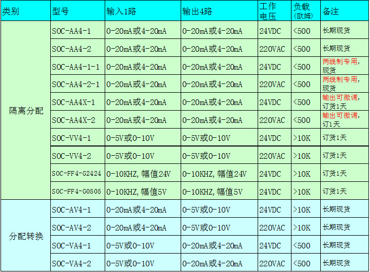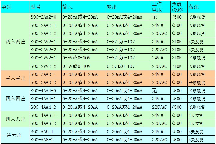 SOC-AA2-1:一路電流信號輸入,兩路電流信號輸出,供電方式為24VDC供電,沒有配電輸出。